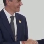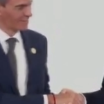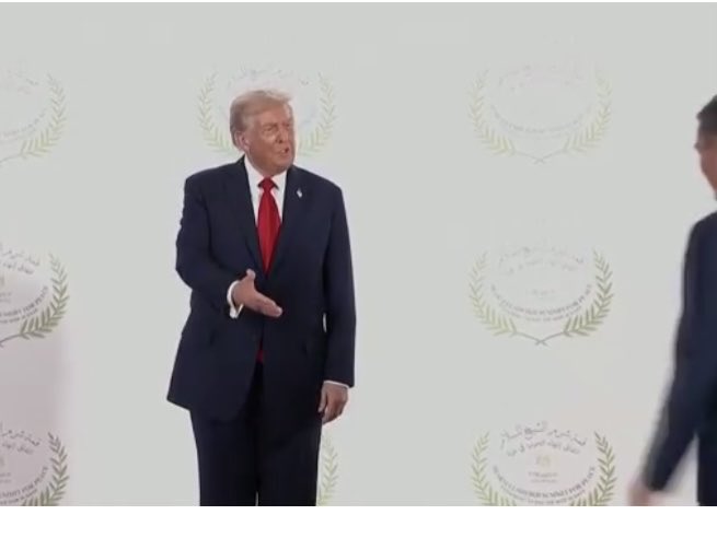 Resumen gestual del saludo disfrazado de diplomacia entre Trump y Sánchez en Egipto, después de que el estadounidense sugiriera que España debería salir de la OTAN al no aumentar su gasto en defensa.