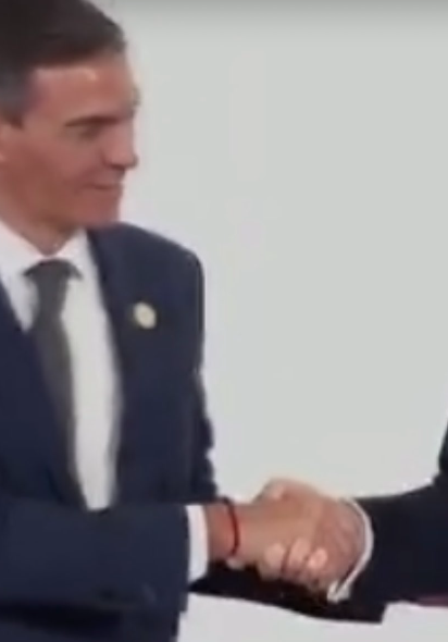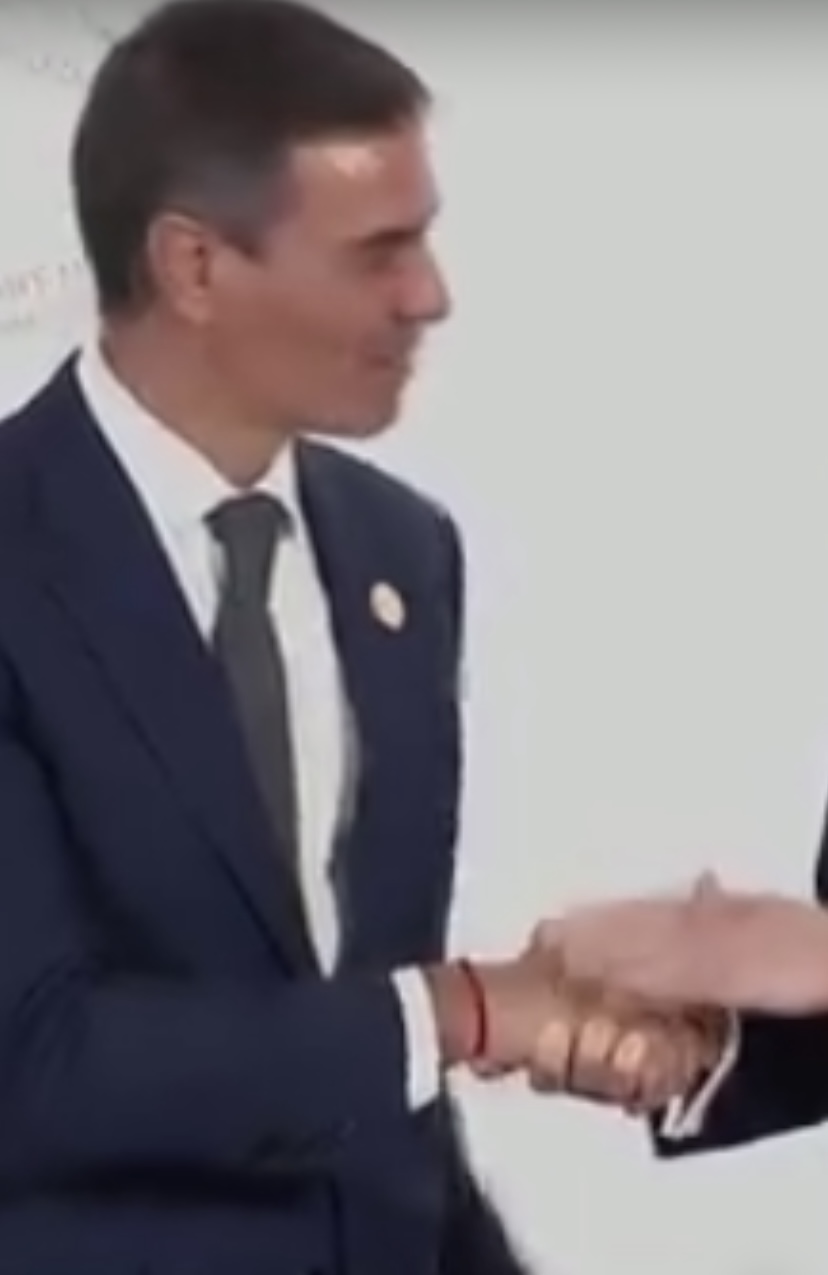 Tirón Es también marca personal de Trump al estrechar la mano. Con el tirón se los lleva a su terreno. Sánchez respondió con el efecto muelle, retornando su brazo y mano a su posición original y no permitiendo que el estadounidense dominara el saludo.